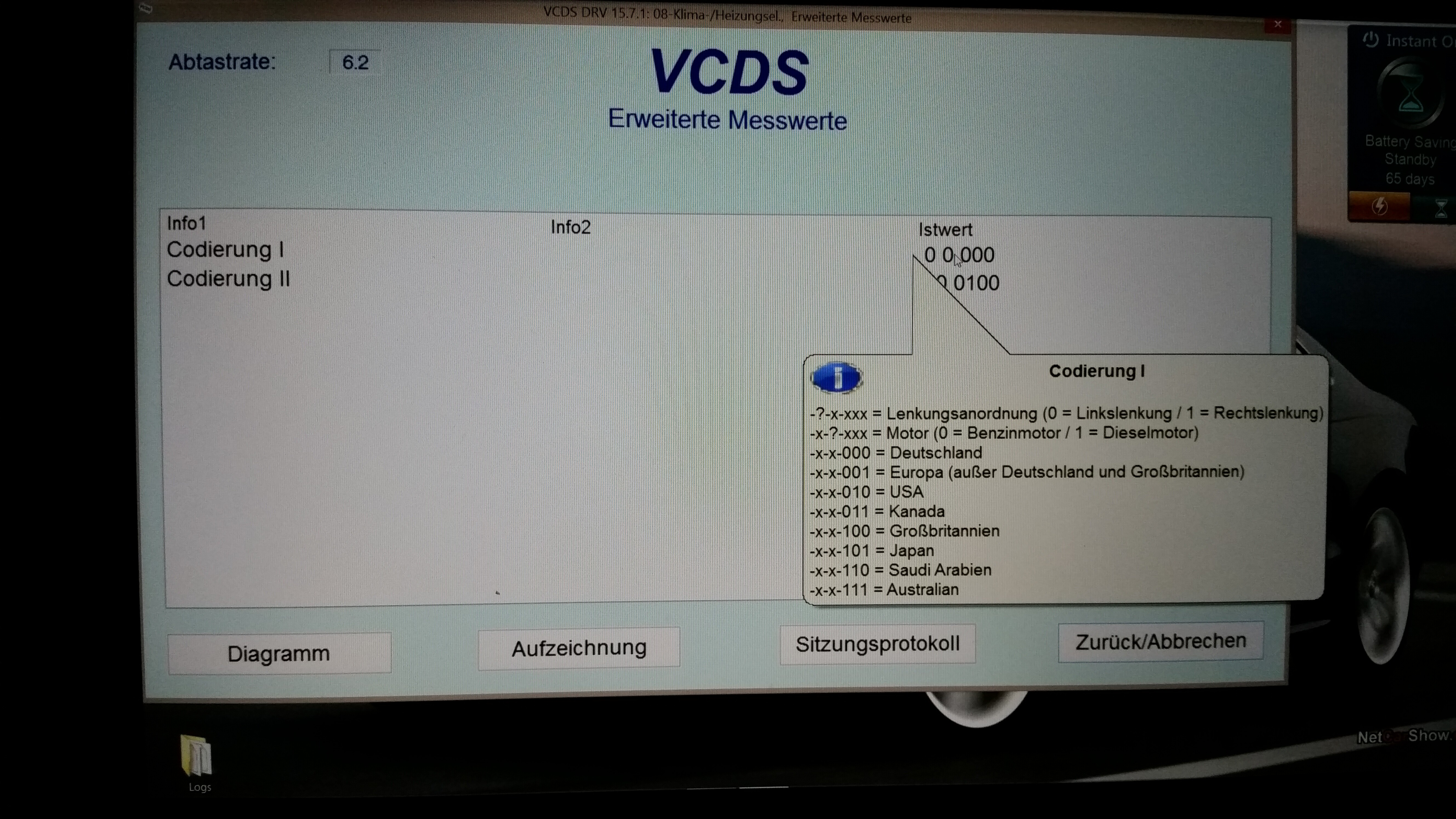 Überprüfe auf jeden Fall mal Messwerteblock 20 ob das bei dir richtig codiert ist! Die Frage ist nur, wie man die Codierung ändern kann… Funktion Codierung ist ja nicht verfügbar.
