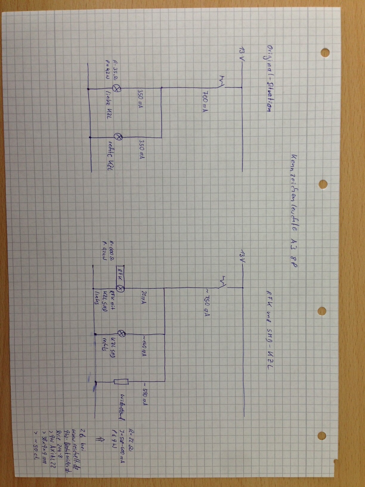 Die originalen (gelblichen) Leuchten haben jeweils einen Widerstand von etwa 35 Ohm und es fließt ein Strom von jeweils etwa 350 mA, also zusammen etwa 700 mA.